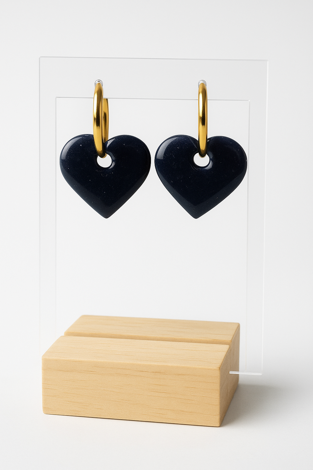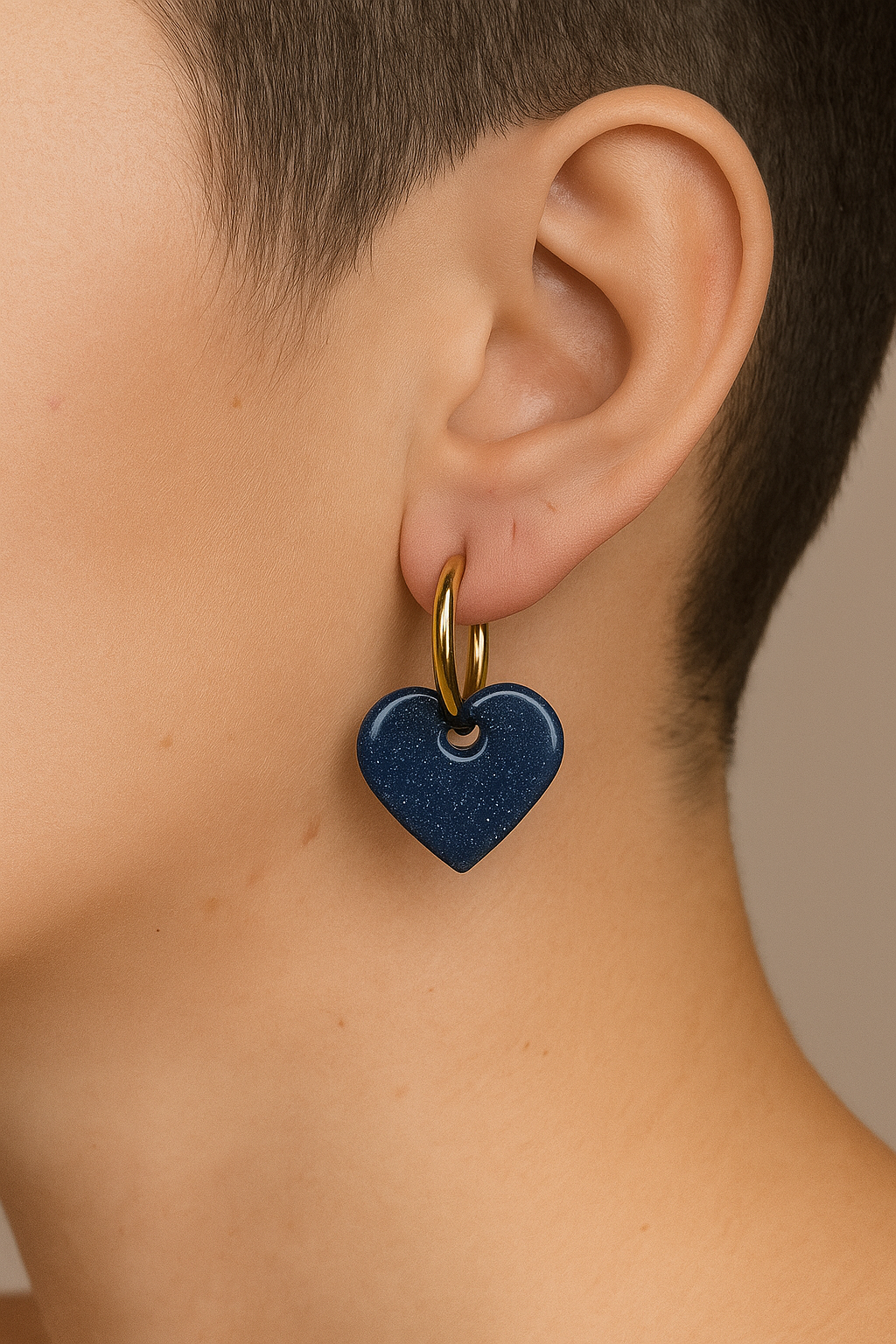 Pampilles cœur bleu nuit pailletées en pâte polymère et finition résine de diamètre 25 mm.